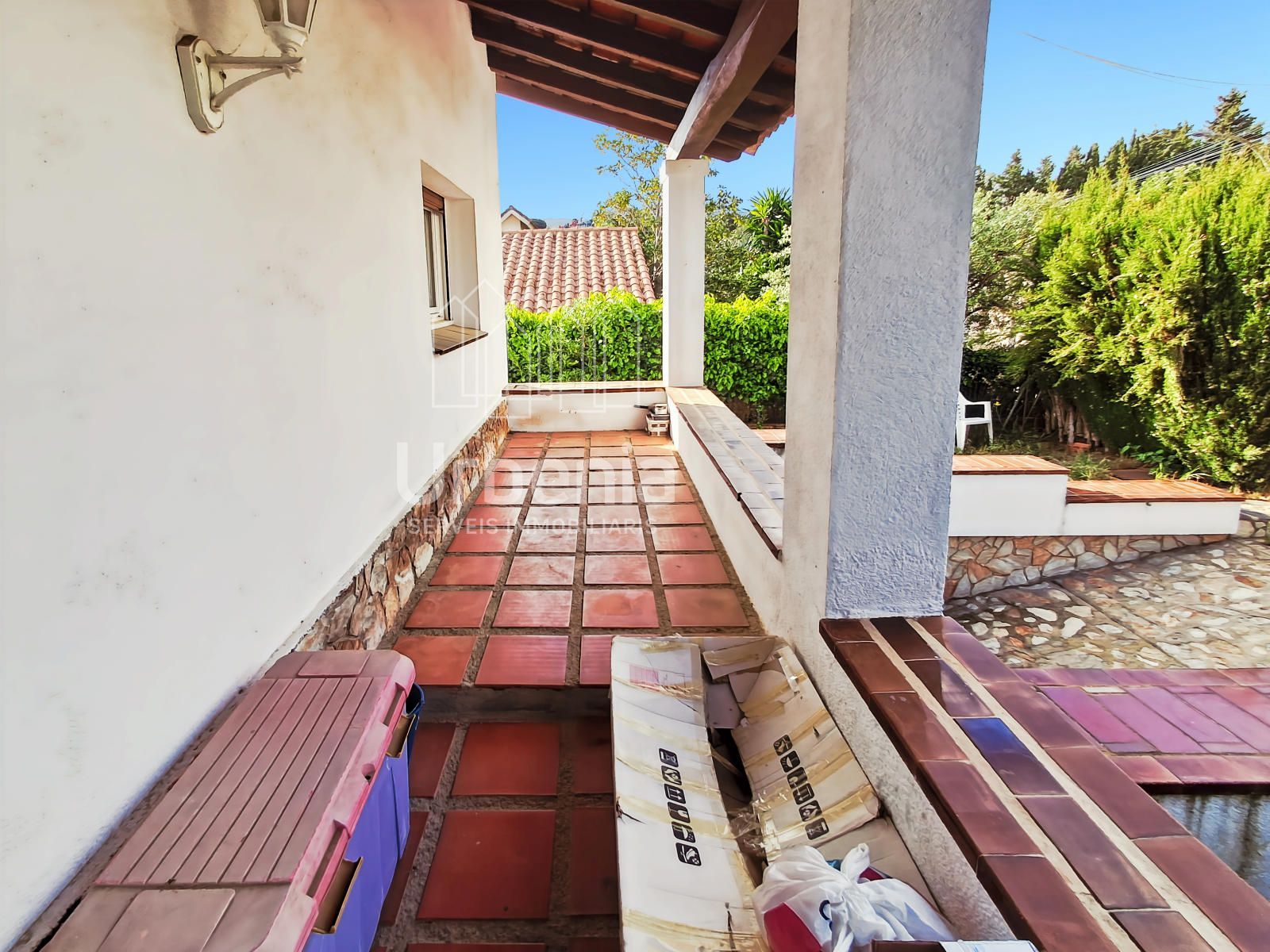La Casa es a cuatro vientos, con orientación sureste, exteriormente dispone de una zona de jardín con piscina y zona de porche exterior para cenas , eventos, muy íntima.