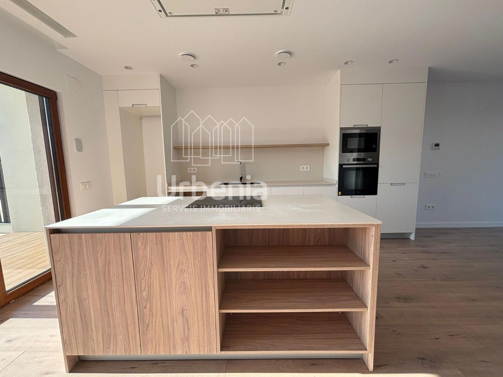 Amplio salón con cocina abierta con una gran isla muy bien equipada de mobiliario en color blanca lacada. Dispone de una campana de alto rendimiento integrada en el techo.