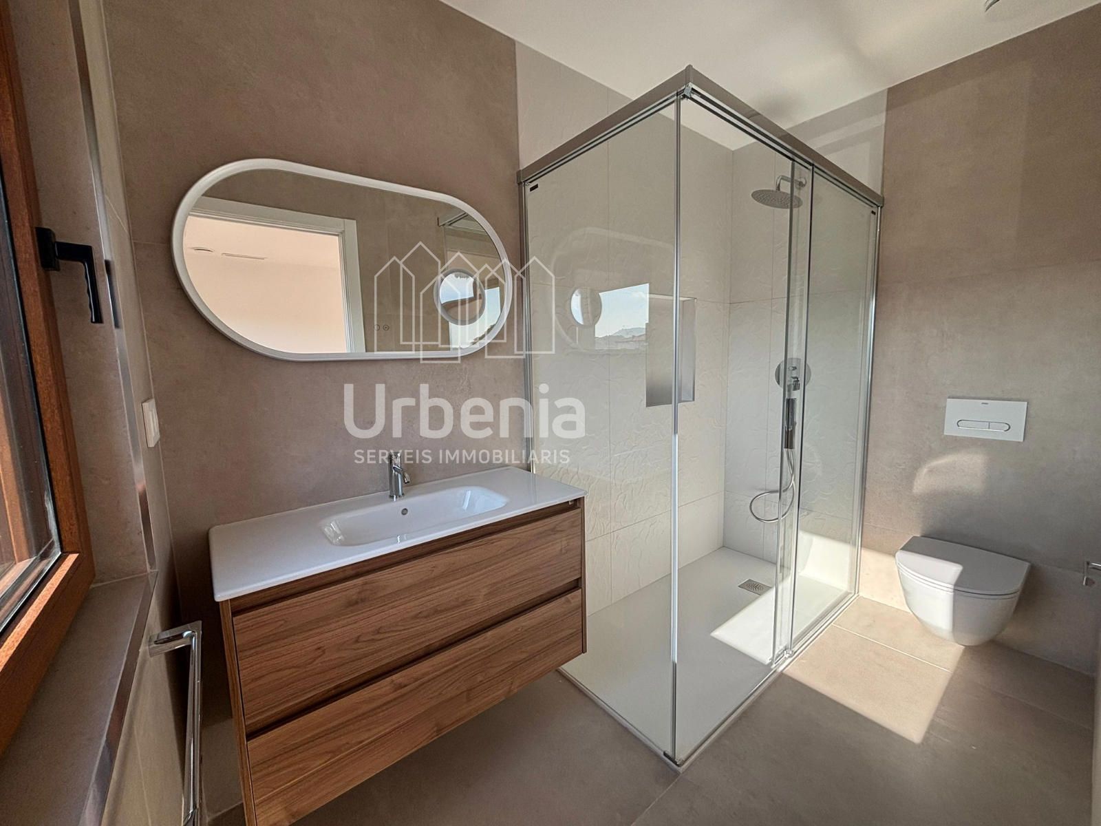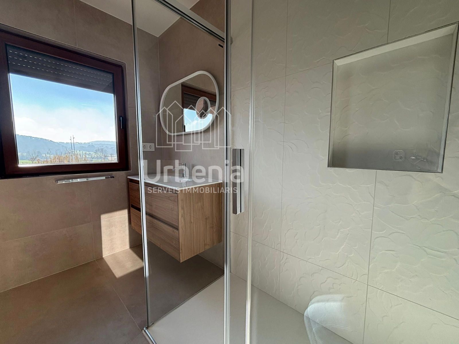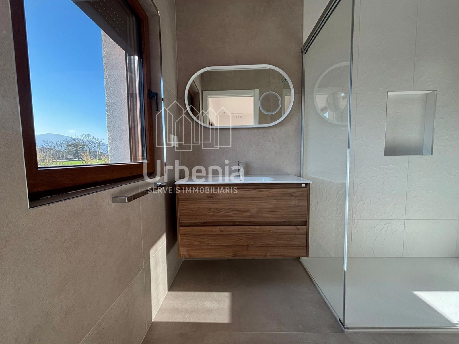 Tenemos un gran dormitorio tipo suite con muy buenas vistas y buen cuarto de baño exterior con plato de ducha de obra mampara de cristal y espejo redondo de leds y mueble.