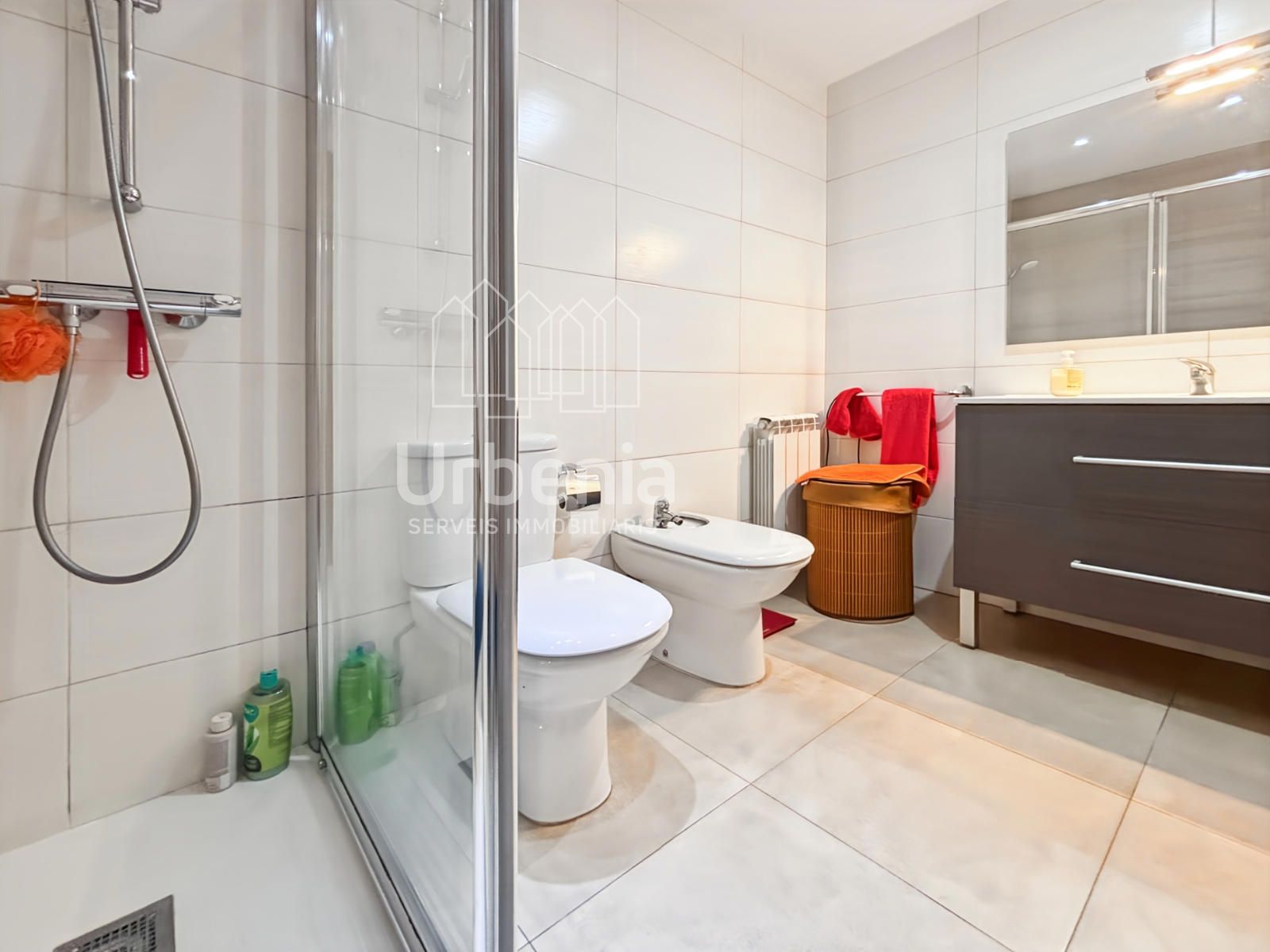 Dispone de Cuarto de baño con cuatro piezas con un gran plato de ducha con mampara.